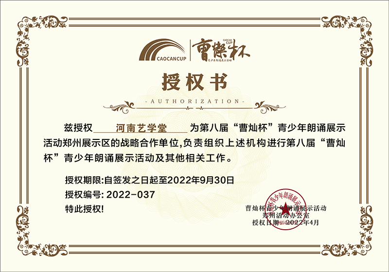 近日,河南藝學堂被授予“曹燦杯”全國青少年朗誦展示活動優秀合作單位、2022年第八屆“愛蓮杯”青少年舞蹈藝術展演選拔賽承辦單位稱號。