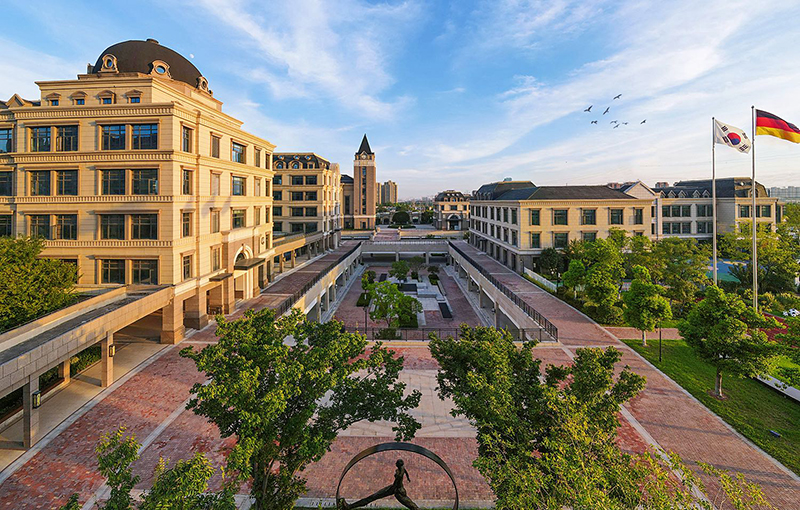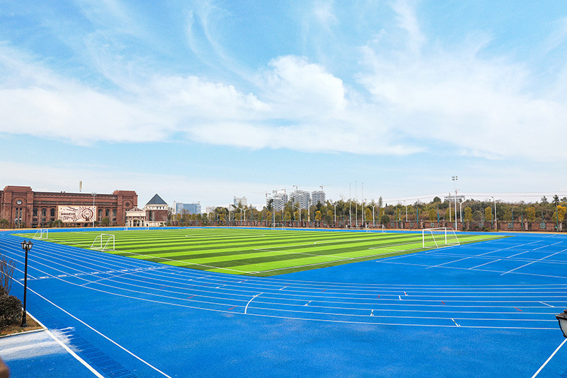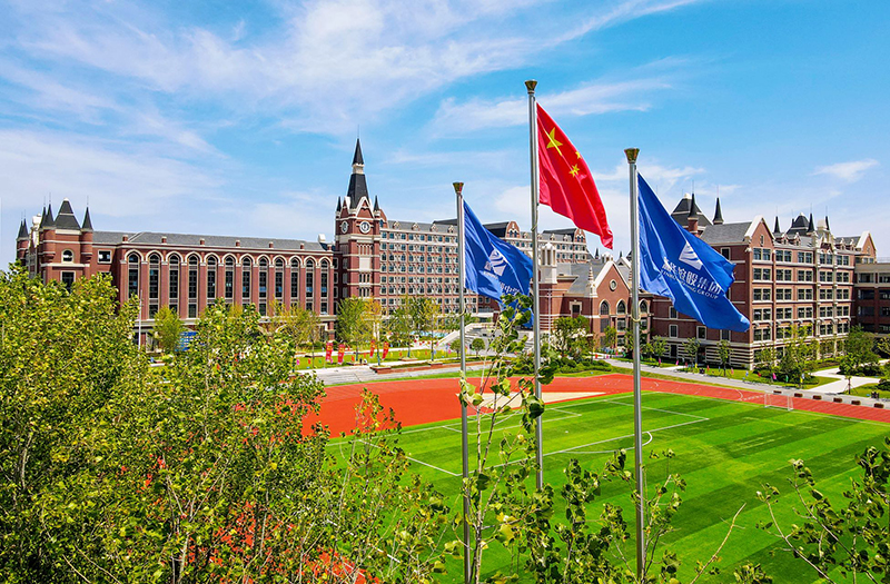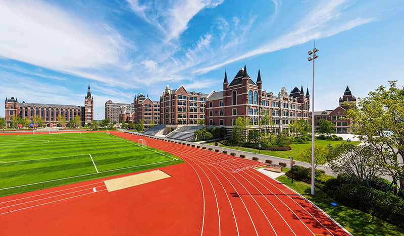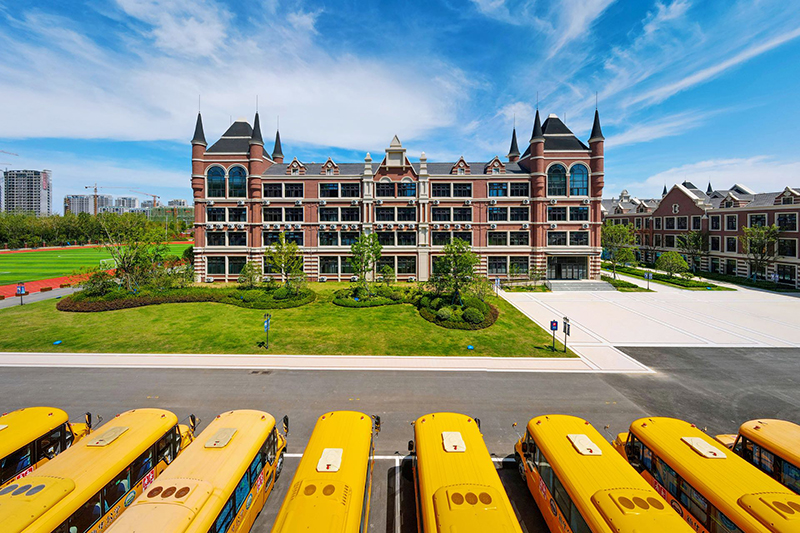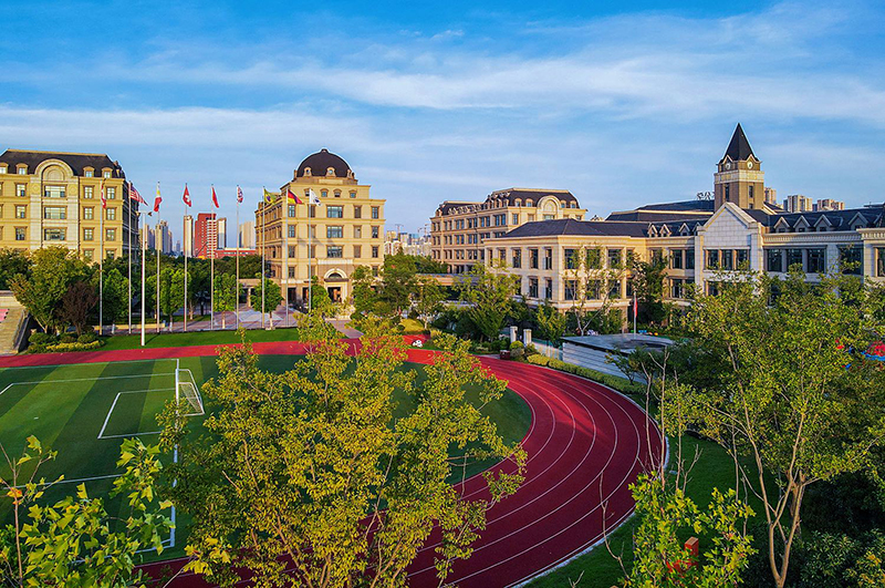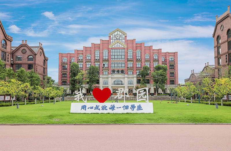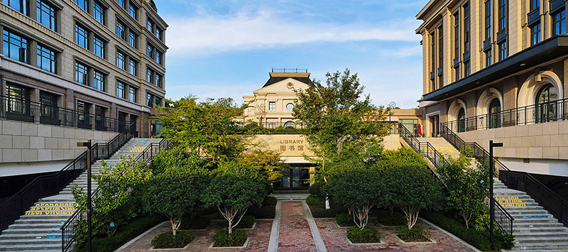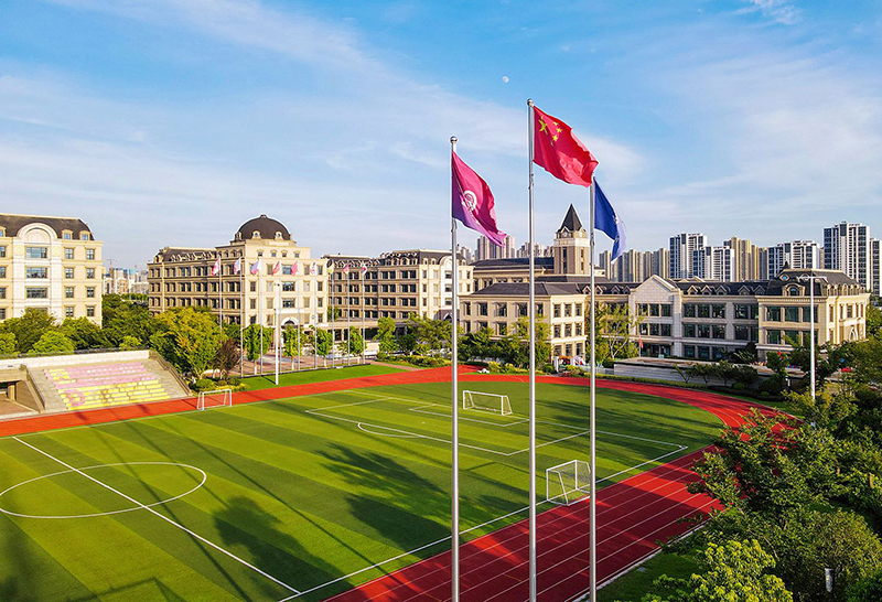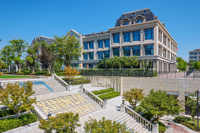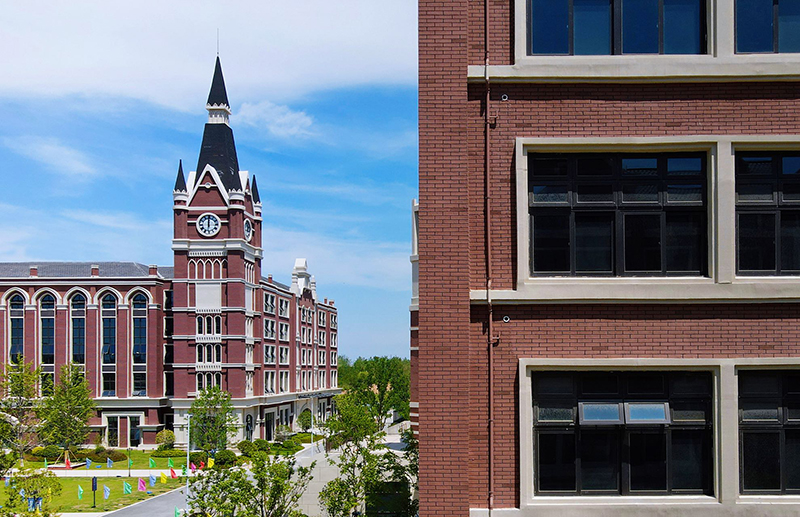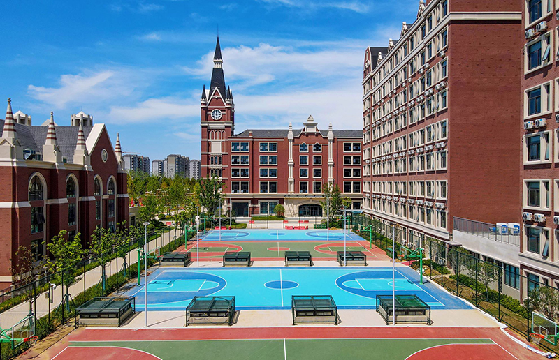 國(guó)際藍(lán)及華夏紅的配色,突顯出校園國(guó)際品質(zhì)感,褐色的墻面搭配綠茵草地,書(shū)香氣息渾然天成。