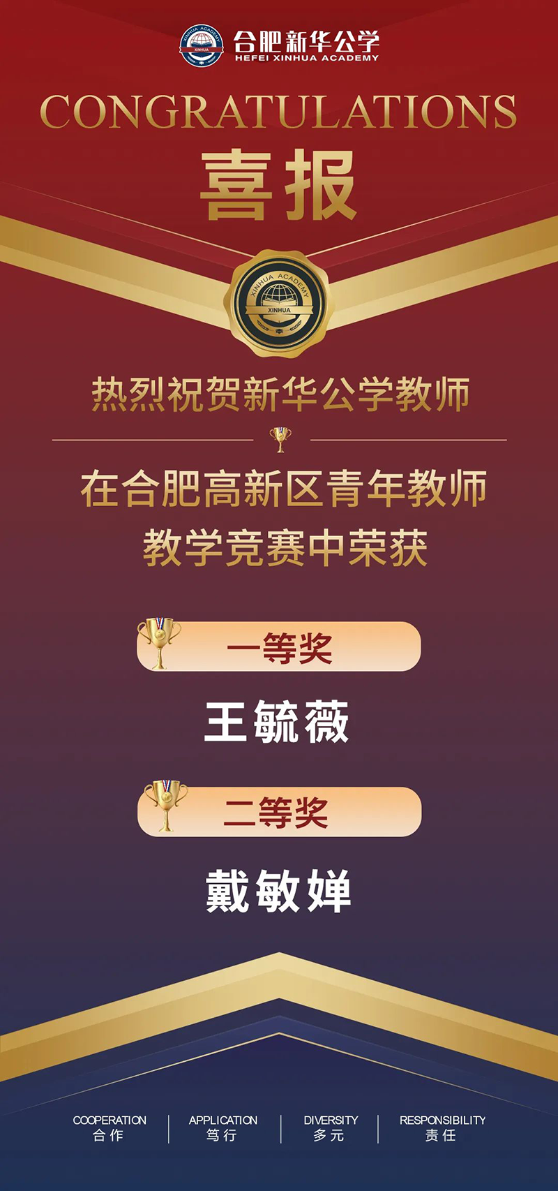 熱烈祝賀我校2名教師在合肥市高新區青年教師教學競賽中榮獲一、二等獎!展現了我校青年教師的卓越風采,體現了我校對青年教師培養的卓越成效!