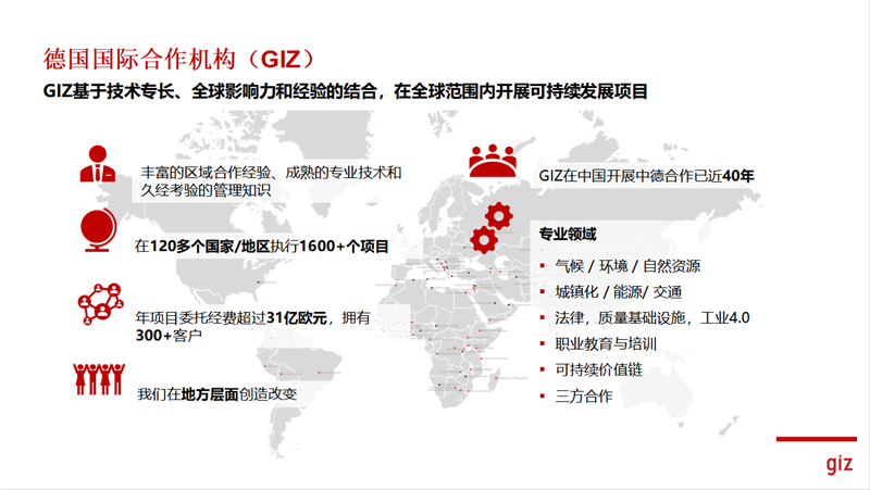 德國國際合作機構(GIZ)是一個在全世界范圍內致力可持續發展的國際合作非營利組織,擁有豐富的區域合作經驗、成熟的專業技術和久經考驗的管理知識。在120多個國家/地區執行1600+個項目,業務范圍共包括氣候/環境/自然資源、城鎮化/能源/交通、法律、質量基礎設施、工業4.0、職業教育與培訓等。