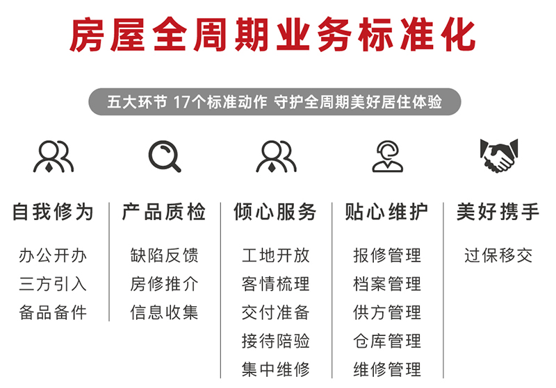 “我們的標準是什么?”“做到什么程度才叫標準化?”華地房屋維保中心團隊從工作中總結經驗,對標行業標桿,取長補短。本著“以客戶為中心”的宗旨,伙伴們多次修訂終于完成了華地房屋維保七步法、全周期業務標準化的編制,包括自我修為、產品質檢、傾心服務、貼心維護、美好攜手等五大模塊標準化。