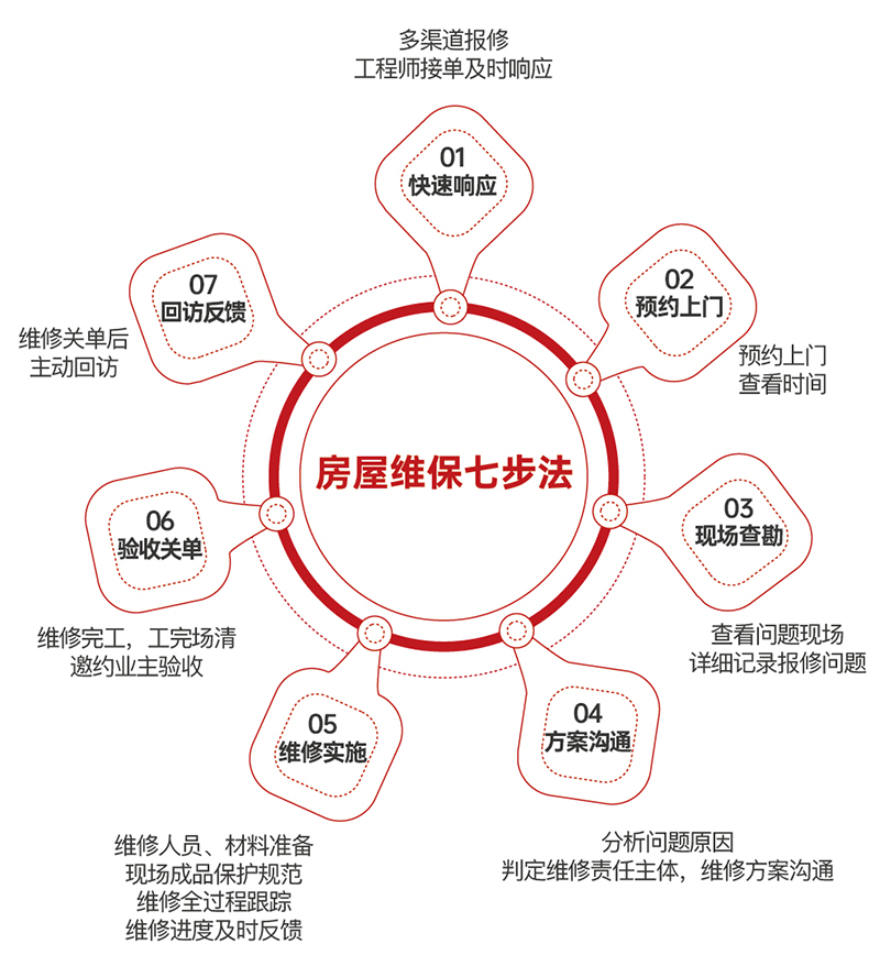 華地房屋維保中心以明確的規章制度、標準化的服務流程和規范要求,詮釋房屋維保服務理念,煥新美好生活,從專業出發、從細節出發,為您排憂解難,守護業主每一份信賴。