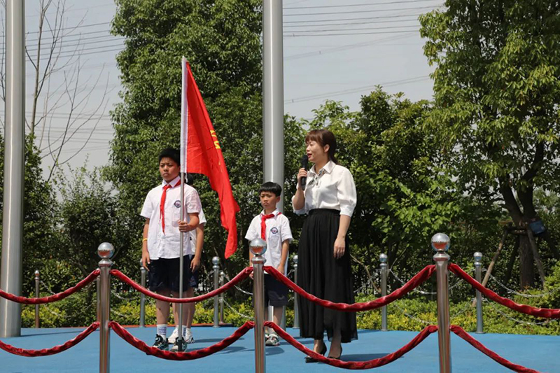 在莊嚴的《出旗曲》中,旗手們高舉鮮紅的隊旗,邁著整齊的步伐出場,新隊員入隊儀式正式拉開了活動序幕。全校師生齊唱《中國少年先鋒隊隊歌》,歌聲響徹校園,唱出了朝氣,唱出了期盼!在這一刻,所有少先隊員的心緊緊地凝聚在了一起。