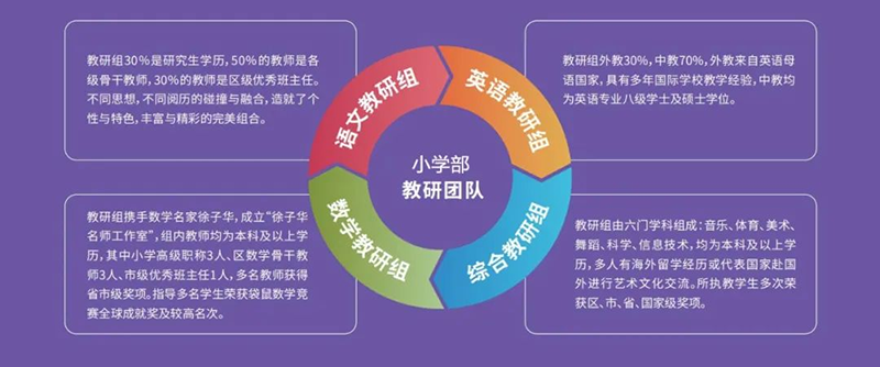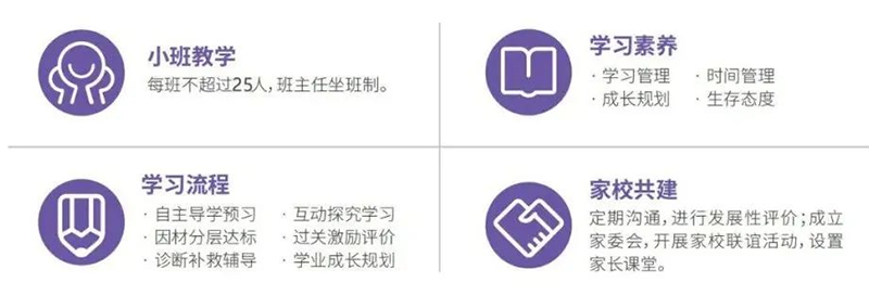 小學課程與教學活動圍繞興趣培養、學習技能及思維方式進行編排;各學科中外教師共同備課,幫助學生建立廣泛的知識關聯;設置多學科融合探究,提升學科素養;分層教學模式及項目式合作學習,針對性提高學生的學術水平;鼓勵學生參與實踐活動,提高學生獨立思考與合作創新能力。
