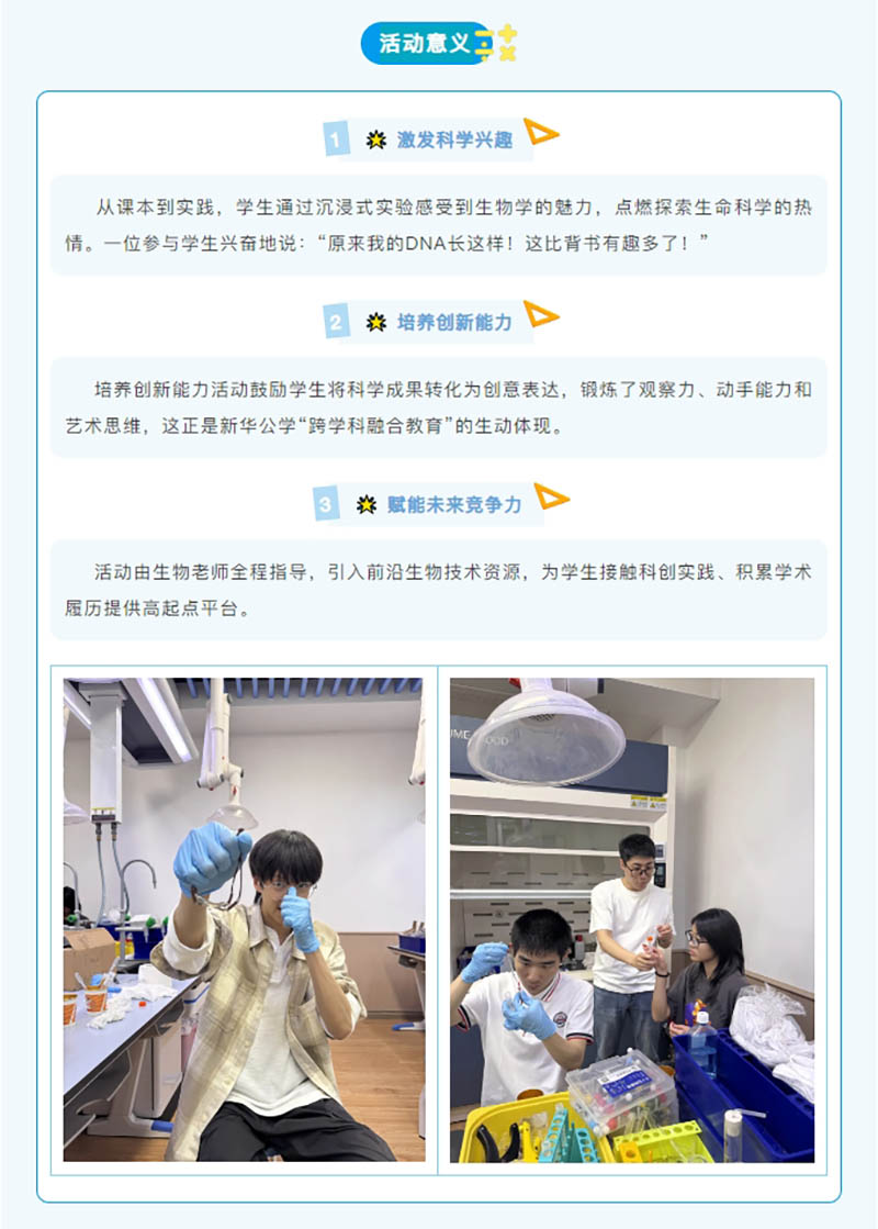 這場活動不僅是生物實驗,更是一次科學與藝術(shù)的跨界創(chuàng)作。通過親手操作,學生理解了基因的微觀奧秘,同時將抽象的科學概念轉(zhuǎn)化為可觸摸的創(chuàng)意作品,真正實現(xiàn)了“知識可視化”!